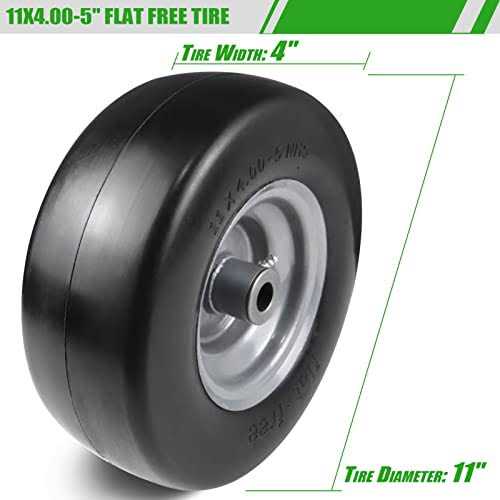 Tires by Aremae. Details: Maintenance Advice: If you park your mower on a hard surface for a long time, please lift the front tire off the ground, or they will have a flat spot next time you go out mowing; If the park time is short, don’t park on hard surface, park it on the dirt outside, they stay round; If your mower have a flat spot, Not a huge deal, they do go back to round after a bit of mowing. Tire Specification: Tire Diameter:11″ Tire Width: 4″ Rim Diameter: 6″ Hub Depth: 3.4″-4”-5″ Centered Hub Bushing size: 3/4″ or 5/8” Load Capacity: 330 lbs(150 KG) Extra Bushings: 2 – 5/8” Sintered Iron Bushings Why Choose Us: FLAT FREE: Made of solid polyurethane foam, maintenance-free and puncture-proof, saving time, no need to worry about air pressure and inflation. The seamless and smooth tread will take care of your lawn; The load characteristics are similar to those of pneumatic tires , It has the bounce and feel of a pneumatic tire without a puncture.