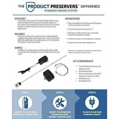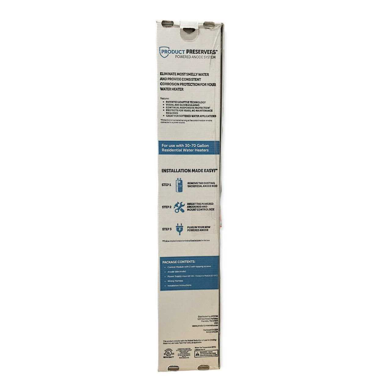 The Product Preservers Powered Anode System is an ideal solution for eliminating smelly water caused by sacrificial magnesium anodes or to replace aluminum anodes where aluminum hydroxide is a problem. The system is also great for new residential gas or electric 30-50 gallon water heater installations providing protection for years with virtually no maintenance required. Protect your investment with a permanent anode rod made of titanium and mixed metal oxide that will never be depleted unlike traditional sacrificial anodes. This latest technology allows the system to quickly adjust to local water conditions providing the precise amount of current for the best protection of the water heater tank. Protection is maintained as long as the control module remains connected to a power source and continually adjusts the amount of protection needed. Additional features include a built-in LED fault light and audible alarm that provide peace of mind knowing the system is working properly.