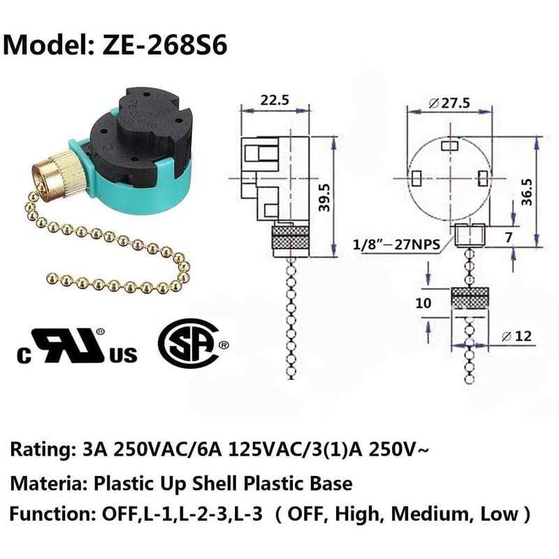- Ceiling Fan Switch 3 speed 4 wire pull chain replacment, Model: Zing Ear ZE-268s6.
