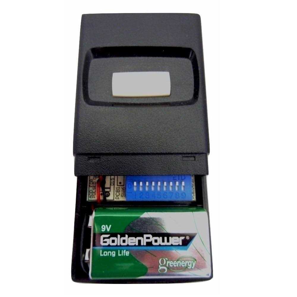 Linear 1-Button Transmitter 9921T/9931T is a one-button, one-channel, 9-Volt battery-powered transmitter with a visor clip, 9-position trinary switch, 512 and 19683 selectable codes.
