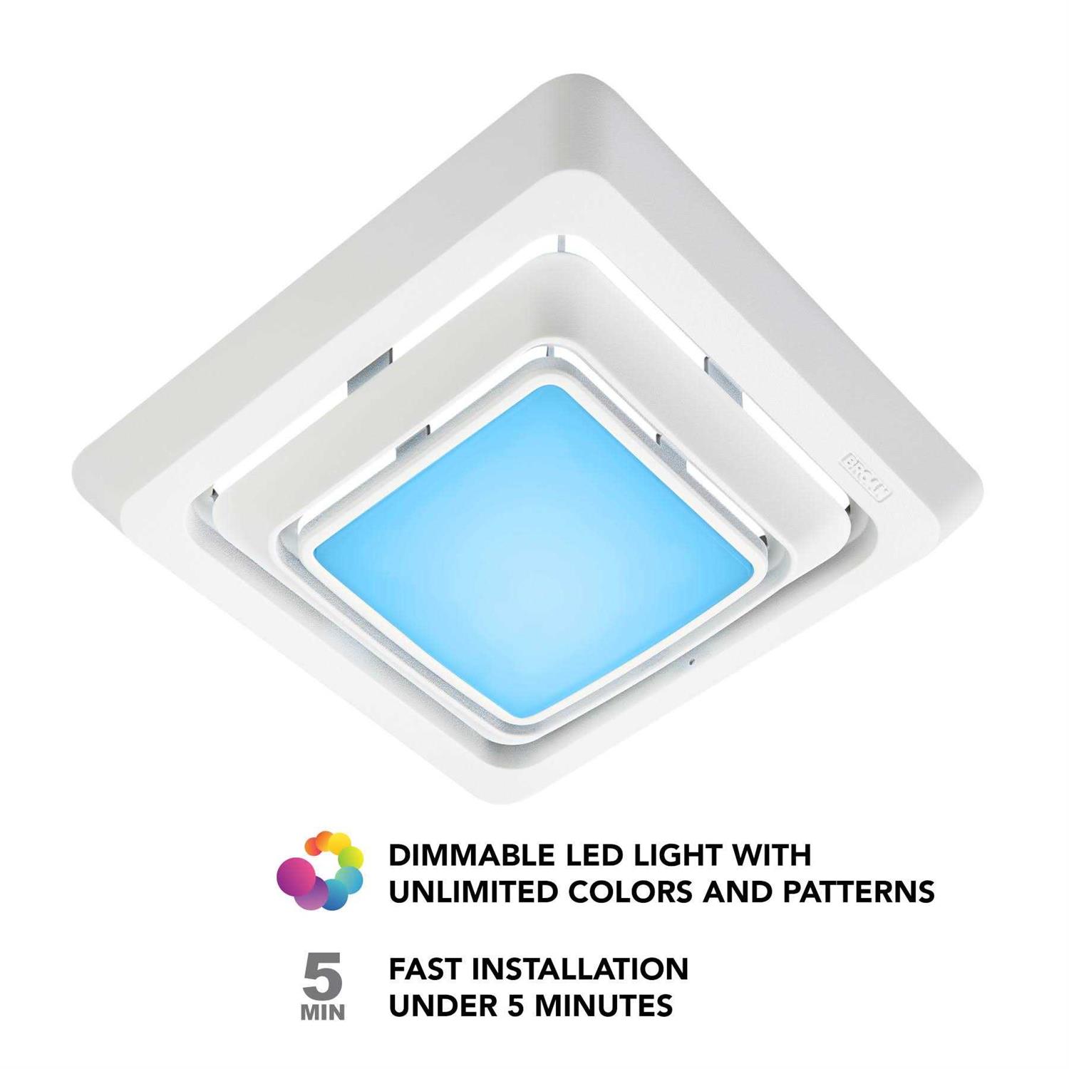Maximize your early morning routines and unwind at night by enhancing your existing bath fan with the Broan-NuTone Replacement Bath Fan cover, featuring the ChromaComfort color changing LED light. This bath fan cover allows you to personalize the ambience in your bathroom with a color changing LED light that offers endless color and pattern options. The app-controlled dimmable light makes it easy to customize lighting themes, adjust brightness, and set timers from the convenience of your smart phone or tablet through the Apple or Android App. Thanks to a quick connect plug, this DIY upgrade can be installed in 5 minutes or less with no tools, no wiring, and no ceiling patching or cutting required, and it conveniently hides existing ceiling cuts. It’s efficiently designed with fewer vent slots to stay clean longer, and the attractive bright white finish matches most modern white ceiling paints. This bath fan cover measures 10-1/4″ x 9-3/4″ x 2-3/8″ and includes 2 sets of springs for use with multiple Broan or NuTone ventilation fan models including those with fan housing dimensions of 7-1/2″ x 7-1/4″, 8-1/4″ x 8″, and 8″ x 7-1/4″. The app is not compatible with the Samsung Galaxy S21 or Google Pixel 6 smartphones.