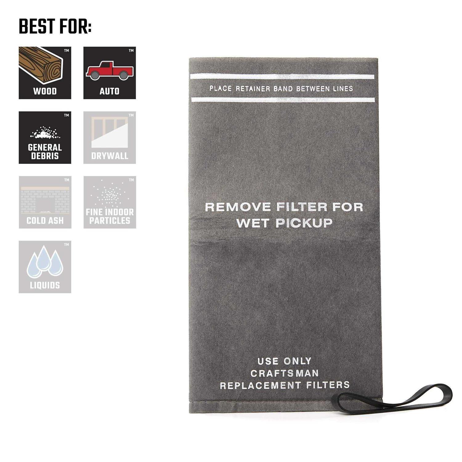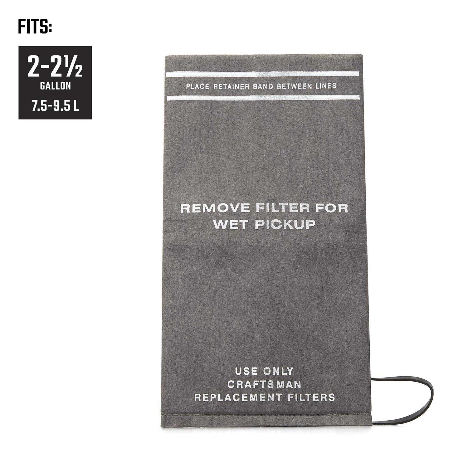 TheCRAFTSMAN 2 to 2.5 Gallon Filter Bags for wet/dry vacs are designed for the cleanup of everyday debris like dirt and dust around the house, smaller project messes and car or truck dirt. Use for dry debris pick-up only. Also compatible with the CRAFTSMAN Powerhead Bucket Head Vacuum. Includes 3 filter bags and retainer band.