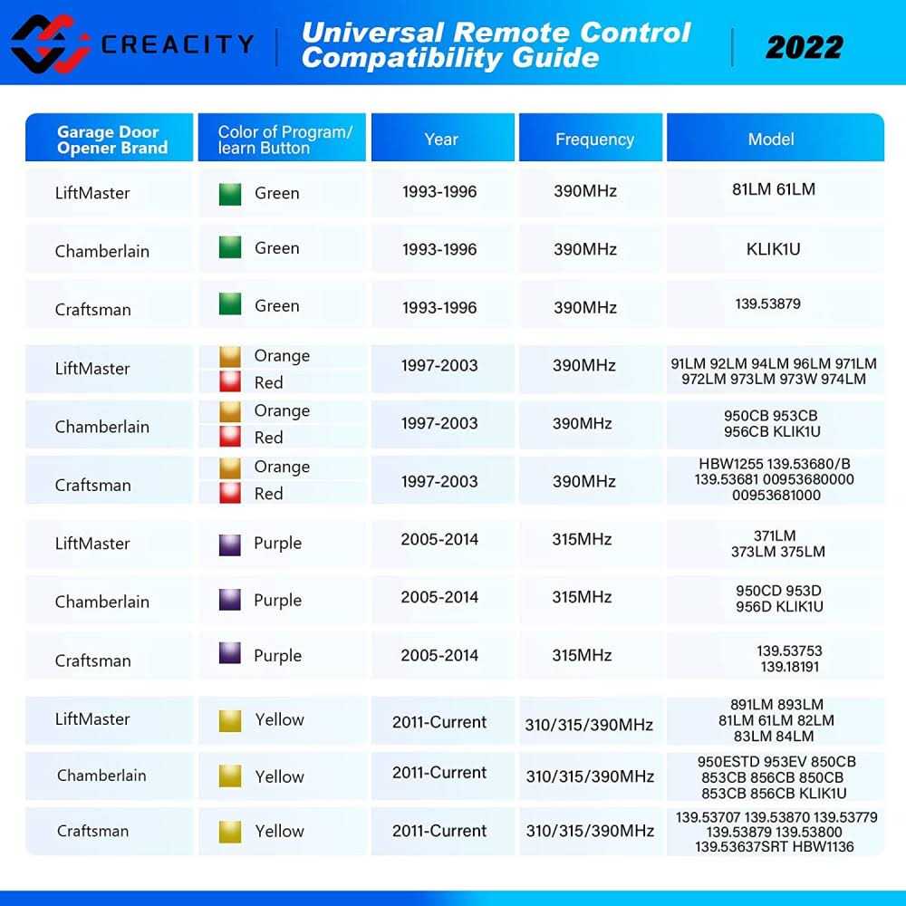 Creacity 2 for Chamberlain LiftMaster Craftsman Garage Door Opener Remote 893lm 893max 971lm Universal