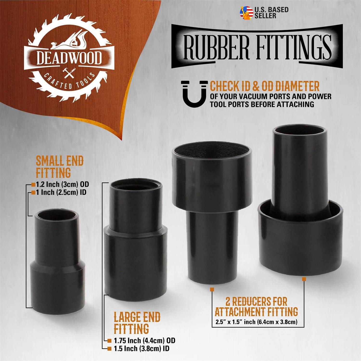 Handheld power tools generate dust, and standard hoses are too bulky and do not flex or maneuver easily. Large hoses are stiff and difficult for sanding as they fight with you and can gouge the wood. This dust collection kit package includes a 10 x 1.25 vac hose, small (1-3/16 OD, 1 ID) and large (1-3/4 OD, 1-1/2 ID) fittings, and 2-1/2 x 1-1/2 reducer adapters. These fittings allow you to set up a dust collection system for bench top tools using your vacuum, or use the reducer and outfit your 2-1/2 inch system with a 1-1/2 inch hose and accessories.