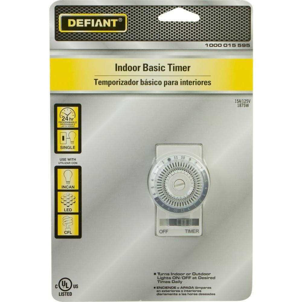 The Defiant 24-Hour In-Wall Mechanical 24-hour timer can save you energy dollars by reducing the operation time of your lamps and other electronic devices. It provides you with 48 convenient on/off settings in a 24-hour cycle. This timer is ideal for outdoor lights, fans and heaters and is compatible with fluorescent, LED, and incandescent bulbs.