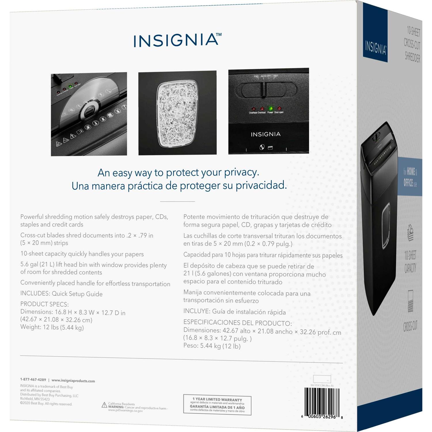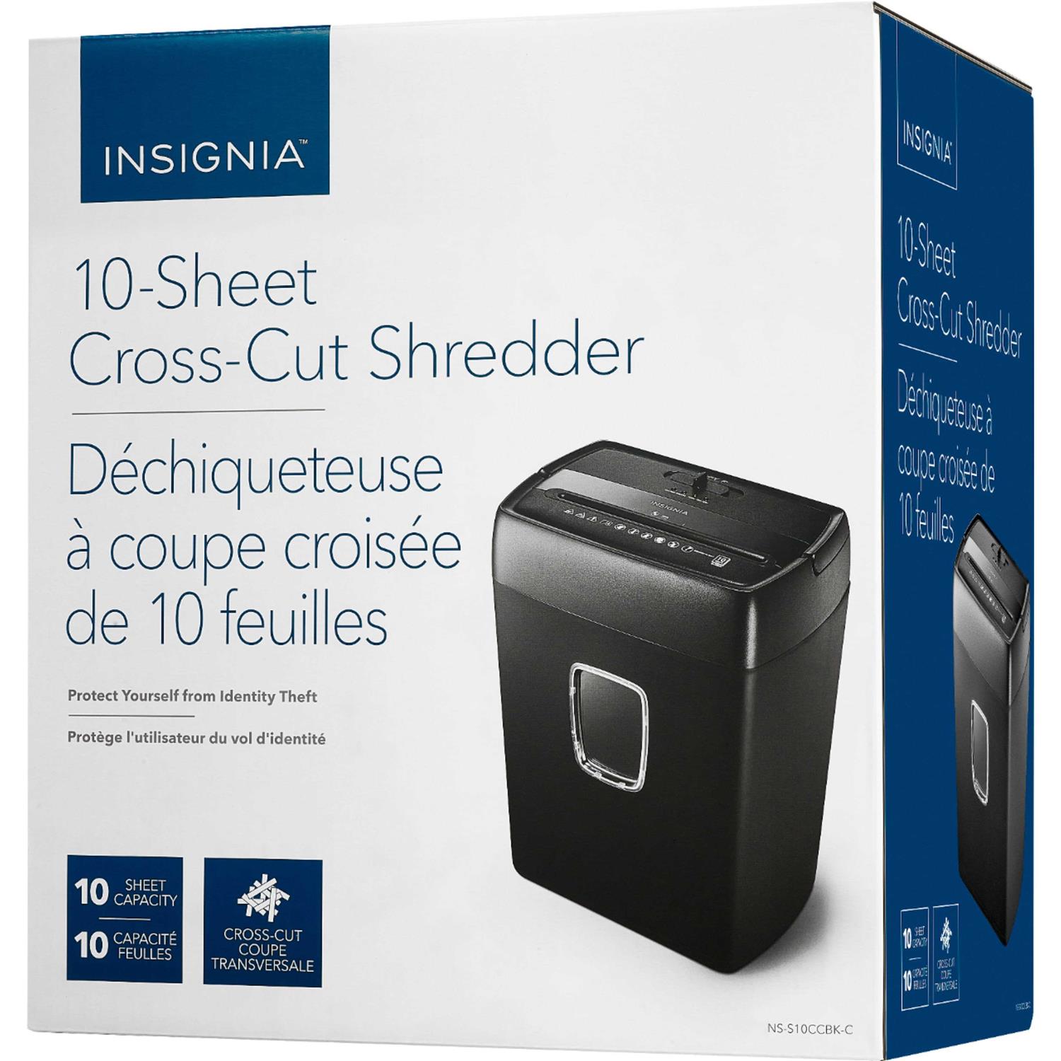 From credit card and Social Security numbers to sensitive tax or client information, you have a lot to lose if your data falls into the wrong hands. Thankfully, data breaches and identity theft aren t inevitable. By crosscutting your items into small pieces, you can have peace of mind that your most sensitive data is protected. This shredder cuts up to 10 sheets of standard-sized paper at once and can handle staples, small paperclips, CDs and credit cards to make your task easier. A built-in wastebasket collects your shredded waste for later disposal. A quick glance through the viewing window lets you know when it needs to be emptied. Protect your important information with the Insignia 10-Sheet Crosscut Paper/CD Shredder.