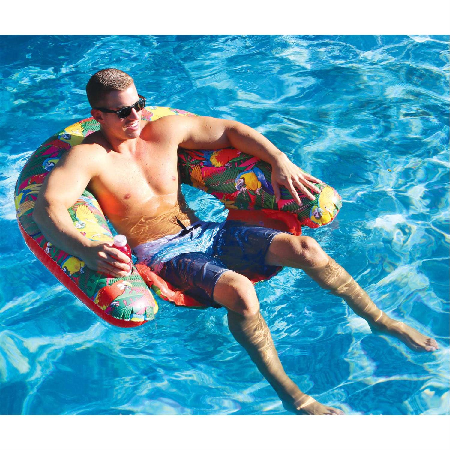 The Margaritaville Sit and Sip might be the perfect inflatable water chair. This 2-sided float features a vibrant parrot print on 1 side and a nice clean red on the other, so you can choose which vibe you are feeling. Either way you go, you’ll have comfortable back and arm rests, an inflatable hammock-style seat, and most importantly access to a cup holder for keeping your favorite beverage close by. Turn your swimming pool into the perfect chill spot with The Margaritaville Sit and Sip. Heavy-gauge construction offers enhanced durability Backrest and armrest deliver utmost comfort 2 cup holders to keep your favorite beverages next to you 2 sides and each have a cup holder Heavy-gauge construction 3-way valve for quick inflation Hammock design – relax while partially submerged in the water Designed for 1-person This affordable Margaritaville Sit and Sip Pool Float might be the perfect inflatable water chair. Turn your swimming pool into the perfect chill spot.