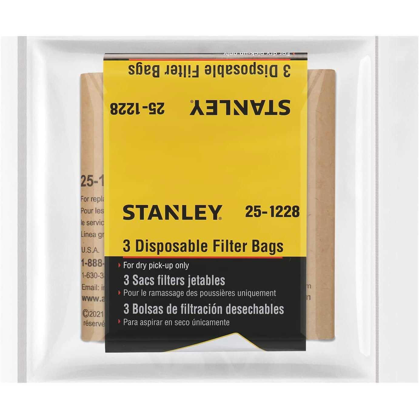 The Stanley 25-1228 High-efficient disposable filter bag is perfect for cleaning and emptying big messes. Collect dust, and debris. The bag is easily disconnected to then throw away when the job is done, or the bag is full. Use for dry pick-up only. From a portable wall-mounted 1-gallon, 1.5 peak HP wet/dry vacuum great for a variety of clean-up tasks in any room at home and the garage to the rugged 14-gallon, 6.5 Peak HP stainless steel vacuum for heavy-duty use, Stanley vacuums make short work of even the toughest jobs, saving you time and effort.