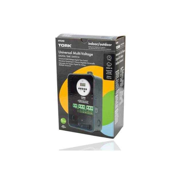 This NSi Industries TORK DTU40 electronic timer can handle up to 40 amp resistive loads, 15 amp tungsten lighting loads, or 1 hp motor loads at 120 VAC. This timer features multiple on/off time settings over a seven-day period in one-minute intervals with different settings for each day of the week. The water-resistant NEMA 3R plastic enclosure is suitable for outdoor use, and features an LCD display, lockable hasp for security, and double-pole double-throw (DPDT) contacts for controlling two loads. A battery backup provides reliability in the event of a power outage. The timer also accepts 208, 240 and 277 VAC input voltages for commercial and industrial applications This electronic timer is Underwriter Laboratories (UL) Listed for quality assurance and is suitable for use outdoors to control lighting and equipment motors.Time switches (also known as timers) are used to automatically turn electrical devices on or off at preset time intervals during a daily or weekly period. Timers can either be mechanical or electronic. Mechanical timers feature a dial with multiple pins to set the on/off time intervals. Electronic timers feature an LCD display and pushbuttons to set the time intervals. Timer switches have one or more device outlets or circuit contacts, and can be used to control indoor lights, outdoor lights, appliances, and small equipment motors.NSi Industries manufactures electrical components and sensors, lighting products, and energy management products. The company, founded in 1975, is headquartered in Huntersville, NC.