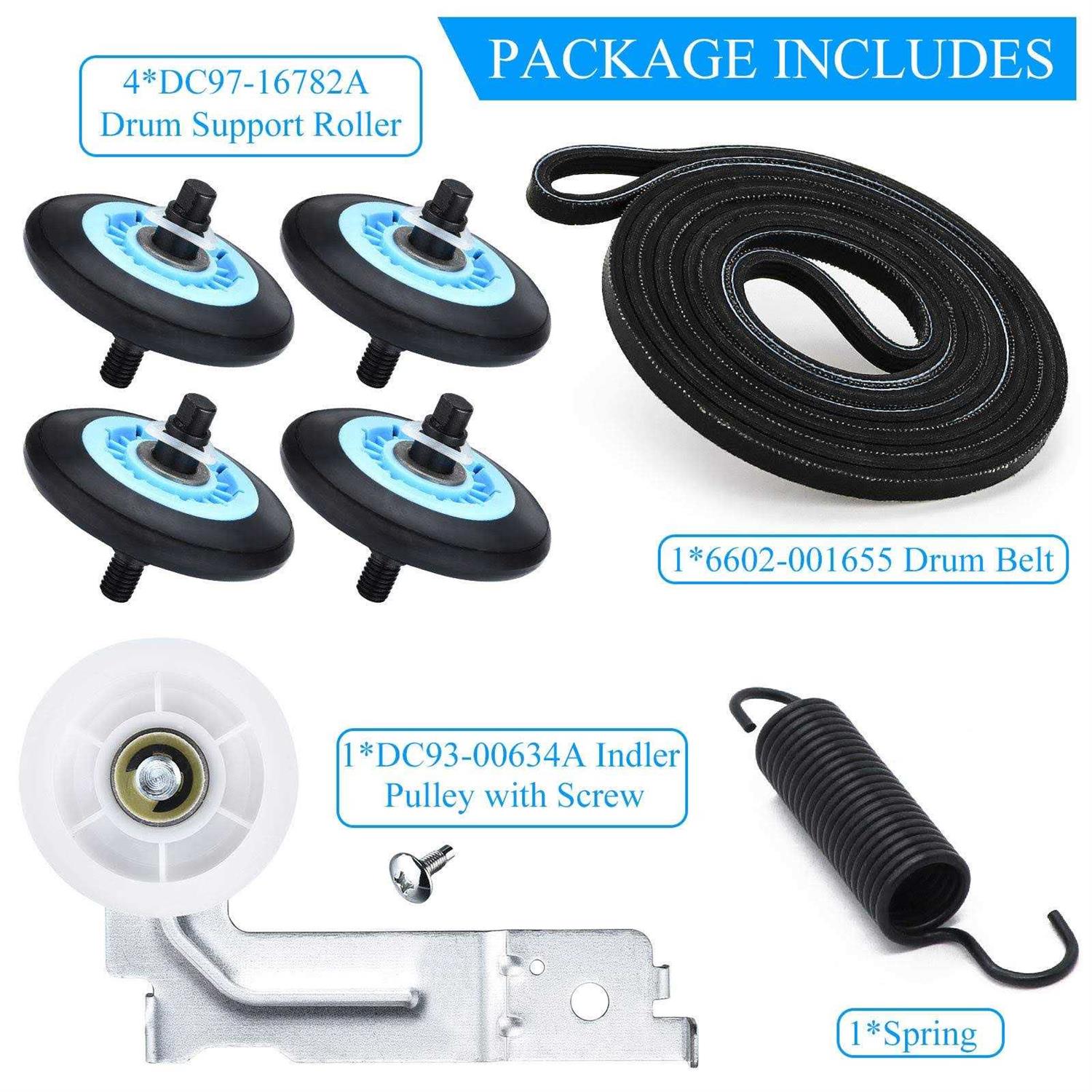 Dryer Repair Kit Includes DC97-16782A Drum Roller 6602-001655 Drum Drive Belt and DC93-00634A Idler Pulley Assembly Compatible with Samsung Dryers 【PACKAGE INCLUDESã€? 4 pcs DC97-16782A dryer drum roller (includes roller wheel and roller axle), 6602-001655 dryer drum drive belt, and 1 pc DC93-00634A dryer idler pulley assembly 【PERFECT REPLACEMENTã€? â‘? DC97-16782A Drum Roller Replaces DC97-07523A, DC97-07523B, 2027851, AP5325135, PS4221885, EAP4221885. â‘? 6602-001655 dryer drum drive belt replaces 5PH2337, 6602-001314, 1935594, AP4373659, PS2407938, EAP2407938. 3DC93-00634A idler pulley assembly dryers replaces DC96-00882B, DC96-00882C, DC97-07509B, 4455850, AP6038887, PS11771601, EAP1177160. And compatible with Samsung dryers 【HIGH QUALITYã€? Dryer replacement part kit are made from durable high-quality material, which well-tested by the manufacturer and meets OEM standards 【EASY REPAIRã€? This dryer replacement part kit easy to fixes many dryer problems such as dryer is noisy, will not tumble, leaves marks on clothes, or will not start etc. Easy to install, saves your time and money from expensive repairs ã€? 0 DAYS REPLACEMENT OR FULL REFUND PROMISEã€? Don’t hesitate to solve your dryer problems easily!